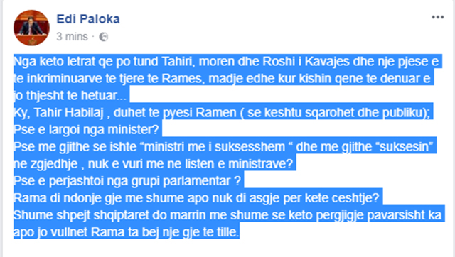 Pas konferences per mediat qe beri sot ne mesdite deputeti Saimir Tahiri, kur nxori nje dokument te Prokurorise se Katanias ne te cilin thuhet sipas tij se shtetasi Saimir Tahiri nuk eshte hetuar asnjehere deri me sot, reagon deputeti i PD Edi Paloka i cili ne nje status ne rrjetet sociale shkruan me ironi se “nga keto letrat qe po tund Tahiri, moren dhe Rroshi i Kavajes dhe nje pjese e te inkriminuarve te tjere te Rames, madje edhe kur kishin qene te denuar e jo thjesht te hetuar…”.