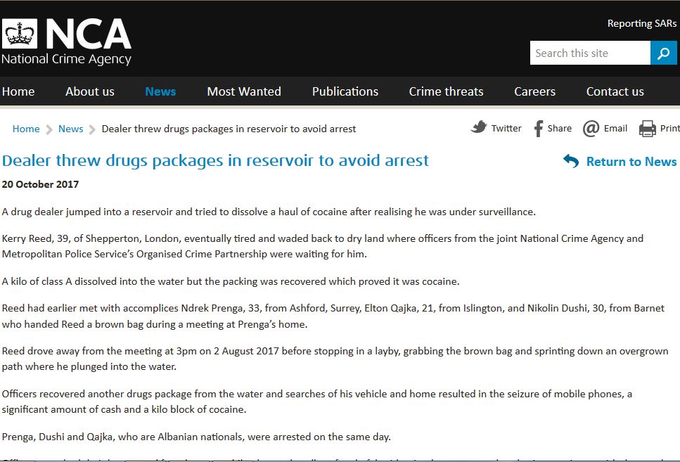 “Ne besojmë se Reed, Prenga, Dushi dhe Qajka janë pjesë e një grupi më të gjerë të krimit të organizuar që shpërndan kokainë me shumicë në një shkallë tregtare në të gjithë Londrën dhe Juglindjen e Anglisë. Ata ishin të punësuar në role të besueshme që përfshinin transportimin e drogës dhe parave të gatshme dhe mbikqyrnin shpërndarjen duke drejtuar aktivitetin e paligjshëm”.