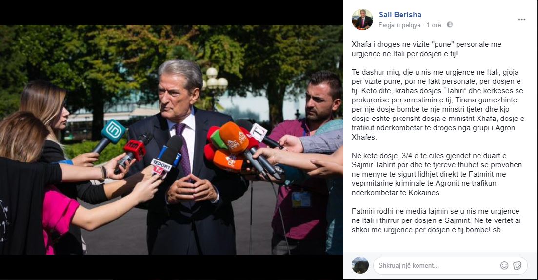 Te dashur miq, dje u nis me urgjence ne Itali, gjoja per vizite pune, por ne fakt personale, per dosjen e tij. Keto dite, krahas dosjes “Tahiri” dhe kerkeses se prokurorise per arrestimin e tij, Tirana gumezhinte per nje dosje bombe te nje minstri tjeter dhe kjo dosje eshte pikerisht dosja e ministrit Xhafa, dosje e trafikut nderkombetar te droges nga grupi i Agron Xhafes.