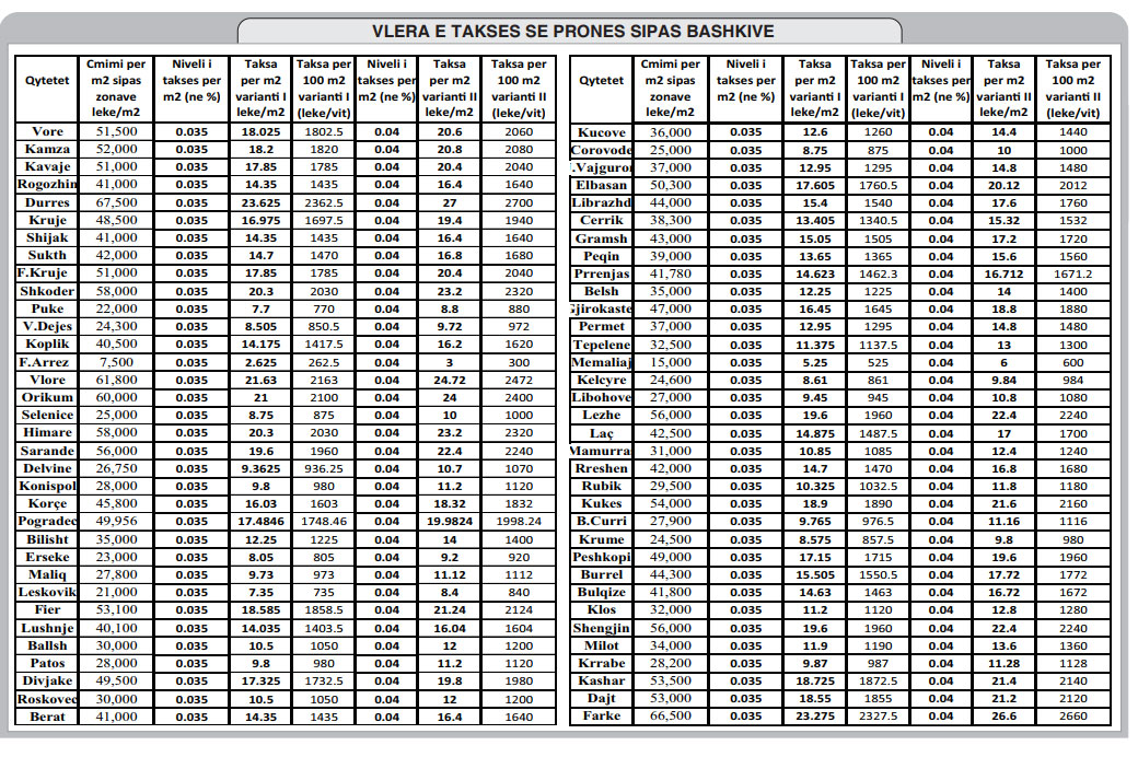 Nëpërmjet tabelës, çdo qytetar mund të kryejë vetë llogaritjet se do të paguajë me taksën e re, sipas dy niveleve që janë në diskutim. Më shumë taksë do të paguajnë qytetet si Durrësi, Fieri, Korça dhe qytetet bregdetare, për shkak të çmimeve të larta fiskale, që kanë këto zona. Formula e re do të nisë zbatimin pas 1 janarit 2018, në 4 zona pilote si Tirana, Durrësi, Fieri dhe Korça.