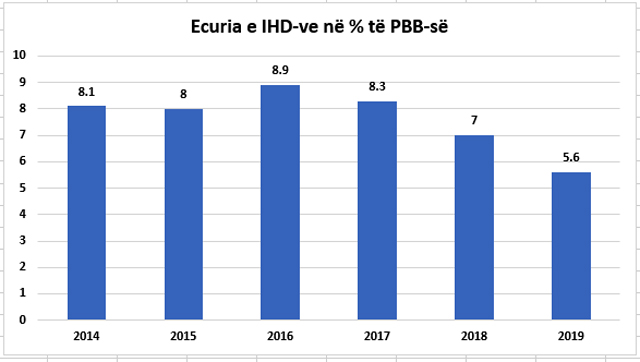 Banka thotë se IHD këtë vit do të arrijnë në 8.3 për qind të PBB nga 8.7 për qind që ishin vitin e kaluar. Por vitin e ardhshëm ato nuk pritet të jenë më shumë se 7 për qind e PBB dhe më 2019 do të jenë 5.6 për qind e PBB-se.