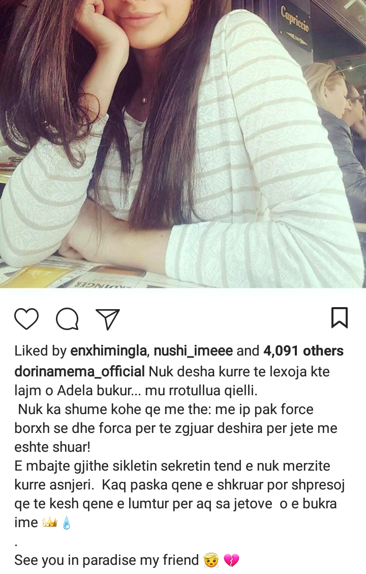 “E mbajte gjithë sekretin përbrenda e nuk mërzite kurrë njeri!”- shkruan  Dorina krah një fotoje të Adelës.