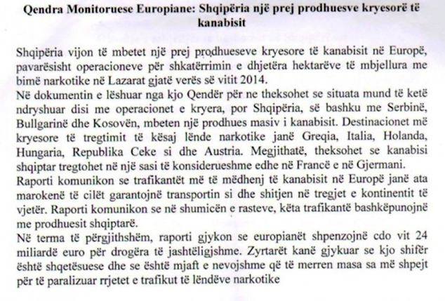 Raporti ishte dërguar një vit më parë në zyrat e Ministrisë së Brendshme, në Prokurorinë e Krimeve të Rënda dhe në Shërbimin Informativ Shtetëror. Ne raportin e Qendrës Monitoruese Europiane, të dërguar institucioneve tona nga shërbimet sekrete Italiane, Shqipëria rënditet si një prej vendeve me prodhimin më të madhe të kanabisit në Europë.