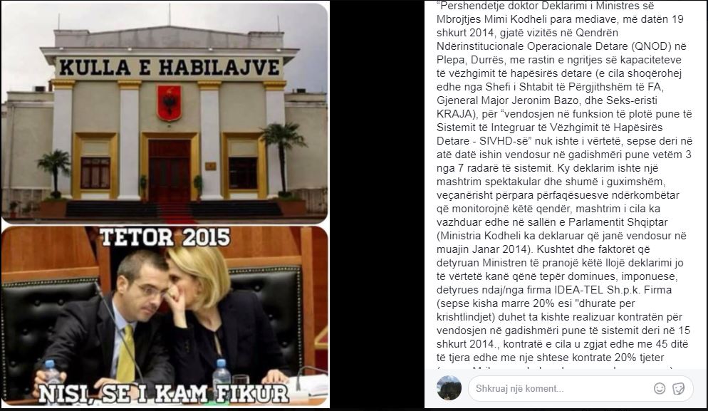 Pershendetje doktor Deklarimi i Ministres së Mbrojtjes Mimi Kodheli para mediave, më datën 19 shkurt 2014, gjatë vizitës në Qendrën Ndërinstitucionale Operacionale Detare (QNOD) në Plepa, Durrës, me rastin e ngritjes së kapaciteteve të vëzhgimit të hapësirës detare (e cila shoqërohej edhe nga Shefi i Shtabit të Përgjithshëm të FA, Gjeneral Major Jeronim Bazo, dhe Seks-eristi KRAJA), për “vendosjen në funksion të plotë pune të Sistemit të Integruar të Vëzhgimit të Hapësirës Detare – SIVHD-së” nuk ishte i vërtetë, sepse deri në atë datë ishin vendosur në gatishmëri pune vetëm 3 nga 7 radarë të sistemit. Ky deklarim ishte një mashtrim spektakular dhe shumë i guximshëm, veçanërisht përpara përfaqësuesve ndërkombëtar që monitorojnë këtë qendër, mashtrim i cila ka vazhduar edhe në sallën e Parlamentit Shqiptar (Ministria Kodheli ka deklaruar që janë vendosur në muajin Janar 2014). Kushtet dhe faktorët që detyruan Ministren të pranojë këtë llojë deklarimi jo të vërtetë kanë qënë tepër dominues, imponuese, detyrues ndaj/nga firma IDEA-TEL Sh.p.k. Firma (sepse kisha marre 20% eshi “dhurate per krishtlindjet) duhet ta kishte realizuar kontratën për vendosjen në gadishmëri pune të sistemit deri në 15 shkurt 2014., kontratë e cila u zgjat edhe me 45 ditë të tjera edhe me nje shtese kontrate 20% tjeter (sepse Mrika u embelsu shume nga hera e pare).