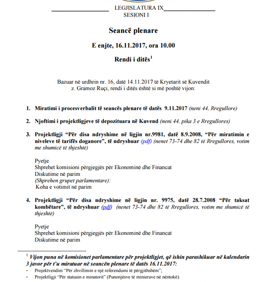 Seanca e ditës së sotme në Kuvend, pritet të jetë një nga më të tensionuarat e kësaj legjislature të re, e influencuar nga vetë zhvillimet e vrullshme në klasën politike dhe shpërthimi i skandalit të ish-ministrit të Brendshëm, Saimir Tahiri. Sot 140 deputetët e Parlamentit të Shqipërisë pritet të votojnë për buxhetin e vitit 2018, që mund të kalojë edhe me një shumicë të thjeshtë, pra vetëm me votat e mazhorancës. Projektligji në fjalë është pika 9 e rendit të ditës, por PD dhe LSI e kanë deklaruar tashmë votën e tyre “Kundër”, pasi sipas kryeopozitarit Basha buxheti i vitit të ardhshëm është një marrëveshje e Edi Ramës për të pastruar paratë e pista të drogës në ekonominë shqiptare. Edhe projektligjet e tjera në rendin e ditës janë kryesisht me karakter ekonomik, si për tatimet dhe tarifat doganore.