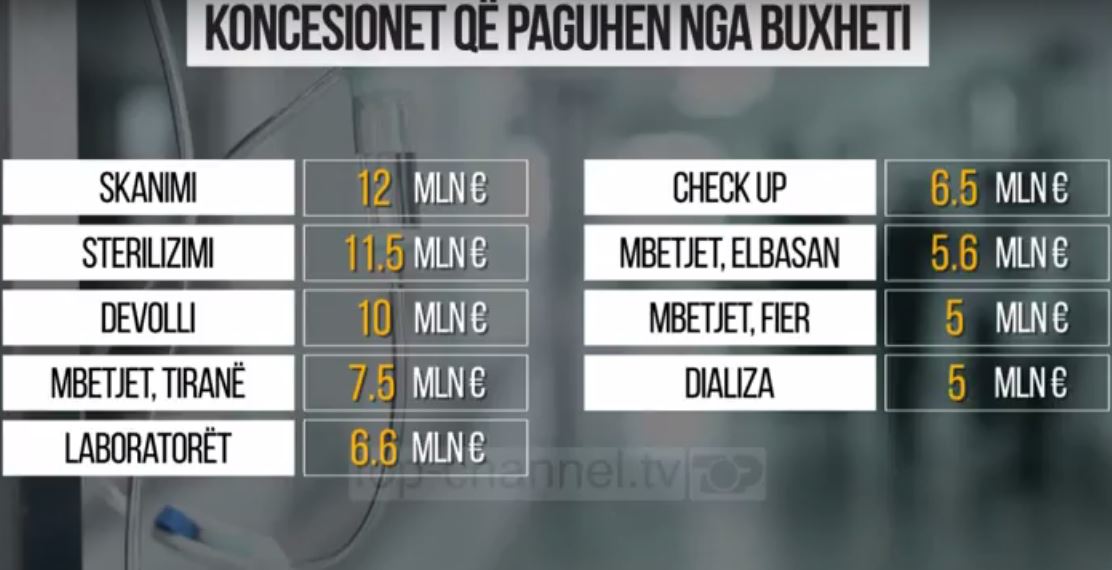 Në vendin e parë renditet koncesioni i skanimit të doganave. Vitin që vjen kompania S2 Albania do të marrë 12 milionë euro nga qeveria. Pas saj vjen koncesioni i sterilizimit i dhënë në vitin 2014. Kompania Sani Service do të përfitojë 11.5 milionë euro nga paratë e taksapaguesve për sterilizimin e pajisjeve kirurgjike.
