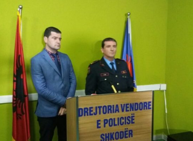 Drejtori i Drejtorisë Vendore të Policisë Shkodër Gjovalin Loka dhe Zv/Prokurori i Rrethit Shkodër Albert Murçaj në deklaratë për median për operacionin “Balerina”.