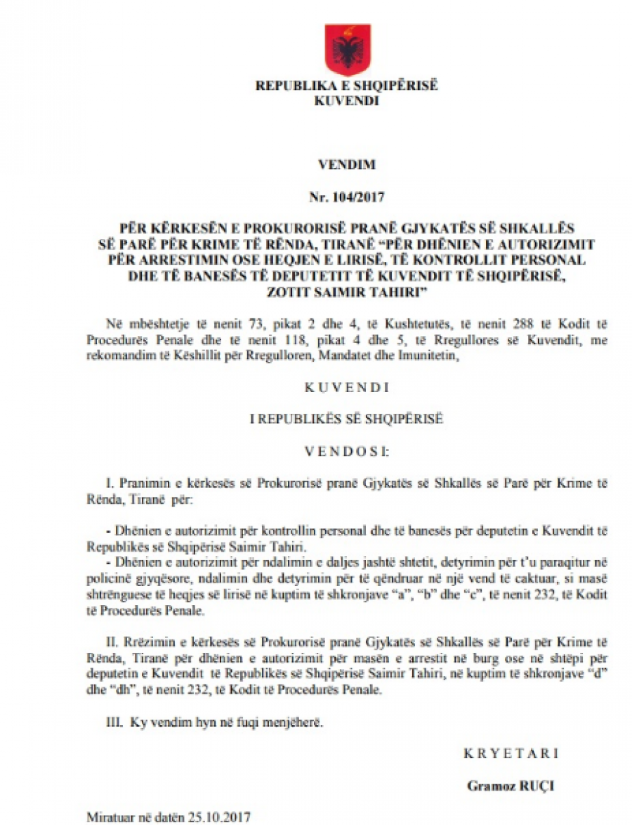 (Kuvendi) vendosi pranimin e kërkesës së Prokurorisë pranë Gjykatës së Shkallës së Parë për Krime të Rënda, Tiranë për: Dhënien e autorizimit për kontrollin personal dhe të banesës për deputetin e Kuvendit të Republikës së Shqipërisë Saimir Tahiri. Dhënien e autorizimit për ndalimin e daljes jashtë shtetit, detyrimin për t’u paraqitur në Policinë Gjyqësore, ndalimin dhe detyrimin për të qëndruar në një vend të caktuar, si masë shtrënguese të heqjes së lirisë në kuptim të shkronjave “a”, “b” dhe “c”, të nenit 232, të Kodit të Procedurës Penale”, thuhet në vendimin e Kuvendit. Udhëtimi jashtë Shqipërisë i ish-ministrit të Brendshëm Saimir Tahiri vjen pas një heshtjeje të gjatë publike e mungesës së dy ditëve më parë në Parlament, ku emri i tij u risoll në vëmendje gjatë diskutimeve. Burime nga organi i akuzës thanë se për prokurorët e çështjes, ka qenë shumë e nevojshme marrja e autorizimit për “arrest ne burg”, pasi rrezikoheshin provat. Sipas prokurorisë, duke qenë i lirë, Tahiri ka mundësi të ndikojë për provat dhe dëshmitarët.