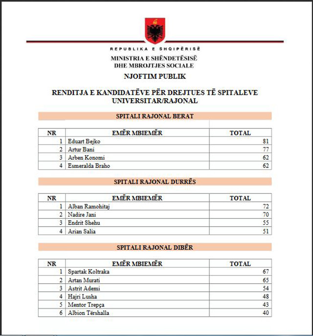 Ndërkohë, është rihapur konkursi për Drejtues të Spitaleve Rajonal Gjirokastër, Korçë, Elbasan dhe Vlorë.