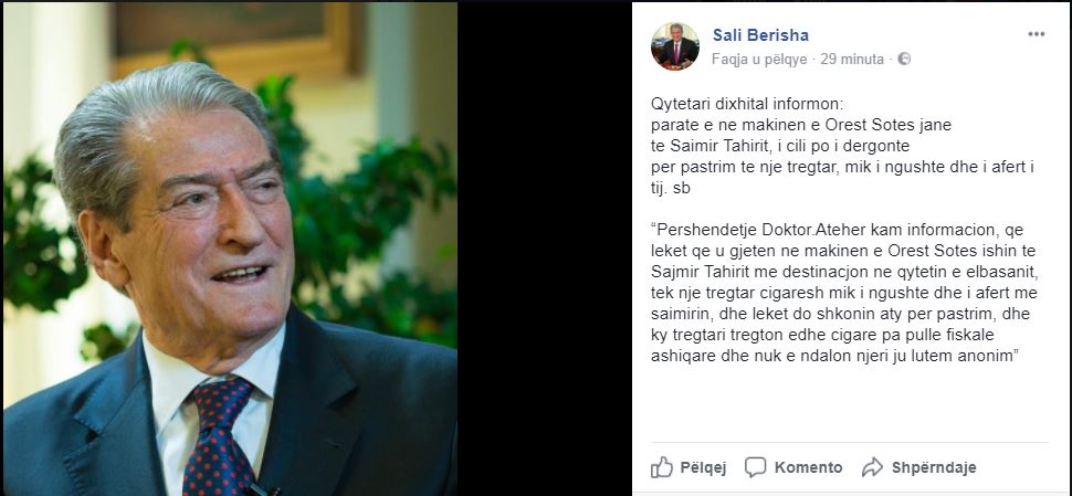 “Pershendetje Doktor.Ateher kam informacion, qe leket qe u gjeten ne makinen e Orest Sotes ishin te Sajmir Tahirit me destinacjon ne qytetin e elbasanit, tek nje tregtar cigaresh mik i ngushte dhe i afert me saimirin, dhe leket do shkonin aty per pastrim, dhe ky tregtari tregton edhe cigare pa pulle fiskale ashiqare dhe nuk e ndalon njeri ju lutem anonim”.