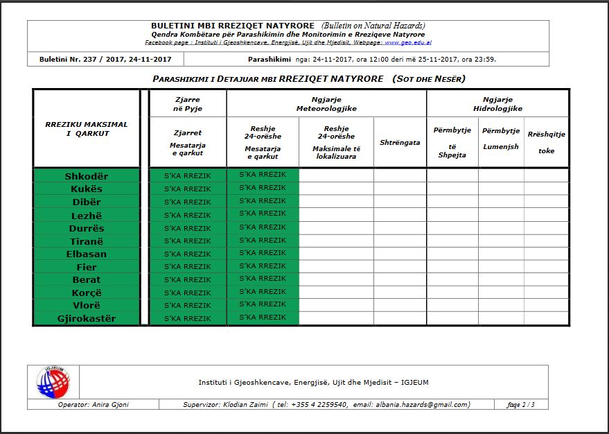 Sot (e premte, datë 24 nëntor) deri nesër në mbrëmje (e shtunë, datë 25 nëntor) nuk priten reshje në të gjithë territorin (siç tregohet në tabelë, respektivisht për secilin qark).