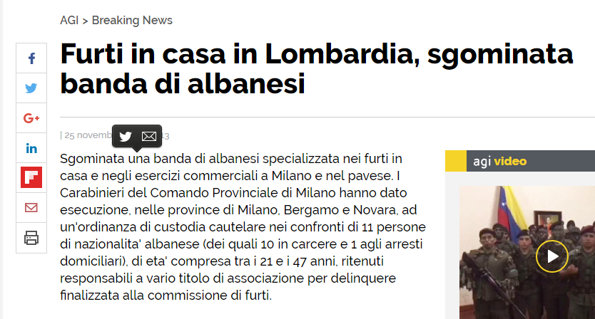 Karabinierët e Milanos kanë ekzekutuar në krahinat e Milanos, Bergamos dhe Novara urdhër arrestet për 11 personave me kombësi shqiptare (nga të cilat 10 në burg dhe 1 u la në arrest shtëpiak), të moshës mes 21 dhe 47 vjeçare.