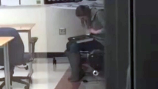 Në atë kohë nuk kishte nxënës në klasë dhe 24-vjeçarja nuk e dinte se po filmohej nga xhami i derës.