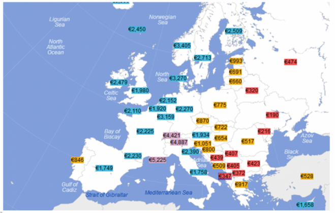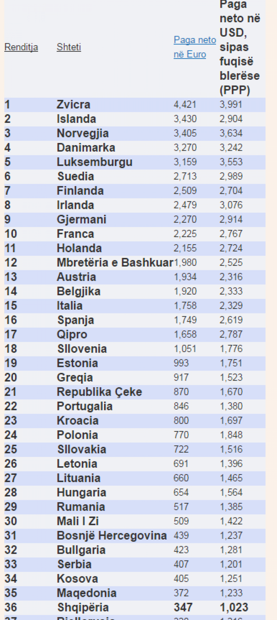 Shqipëria ka pagën më të ulët mesatare në Europë, pa përfshirë vendet e Ish Bashkimit Sovjetik. Sipas të dhënave të përpunuara nga Ëikipedia, bazuar në informacionet e marra nga FMN, Banka Botërore dhe institucionet përkatëse statistikore vendase, në Shqipëri, paga mesatare neto (pas taksave) është 347 euro në muaj, sipas të dhënave që janë përditësuar në tremujorin e parë 2017. Në këtë nivel, paga mesatare është më e ulëta në Europë, me përjashtim të Bjellorusisë, Moldavisë dhe Ukrainës. Ëikipedia i referohet të dhënave të INSTAT për pagën mesatare në sektorin shtetëror, që ishte 56,500 lekë në fund të tremujorit të parë, ndërsa të dhënat e tjera të INSTAT tregojnë se paga reale në ekonomi, përfshirë edhe sektorin privat është akoma më e ulët. Sipas INSTAT, Paga mesatare mujore bruto për një të punësuar me pagë sipas group-profesioneve dhe gjinisë në fund të vitit 2016 ishte 45,845 lekë, pra rreth 334 euro bruto dhe 290 euro neto. Këtu ka ndikim edhe fakti që informaliteti i pagës në sektorin privat është shumë i lartë dhe një numër i madh subjektesh nuk deklarojnë pagën reale për të punësuarit e tyre (shënim i Monitor). Në krahasim me një vit më parë, paga mesatare në ekonomi ra me 2.1% në vitin 2016. Në Kosovë, paga mesatare neto është më e lartë se në Shqipëri, ajo luhatet në rreth 405 euro. Në rajon, sipas Ëikipedia, pagën mesatare më të lartë e ka Mali I Zi, me 509 euro në muaj, e ndjekur nga Bosnjë Hercegovina me 439 euro, Bullgaria me 423 euro, Serbia 407 euro, Kosova 405 euro dhe Maqedonia 372 euro. Edhe e matur sipas metodës së fuqisë blerëse, ku të ardhurat përshtaten me shpenzimet e jetesës, paga në Shqipëri është sërish më e ulëta në Europë, me rreth 1000 dollarë. Madje në këtë renditje, Shqipërisë ia kalon edhe Bjellorusia, që ka pagë mesatare më të ulët sesa ne. Më të lartë pagën sipas fuqisë blerëse e kanë Mali I Zi, që me 1422 dollarë ia kalon edhe Portugalisë, Bullgarisë dhe Rumanisë dhe Kosova (1251), që ia kalon dhe Serbisë e Bosnjës. Në të dy këto shtete, kosto reale e jetesës është më e lirë, rroga është më e mjaftueshme për të blerë produkte të ndryshme, në krahasim me Shqipërinë, apo shtete të tjera të rajonit. Në Europë, vendi ku ke mundësi të marrësh më shumë të ardhura përmes pagës është Zvicra me 4,421 euro në muaj, të ndjekura nga Islanda me 3,430 euro, Norvegjia (3,405), Danimarka (3,270), Luksemburgu (3,159), Suedia (2,713). /Syri.net/