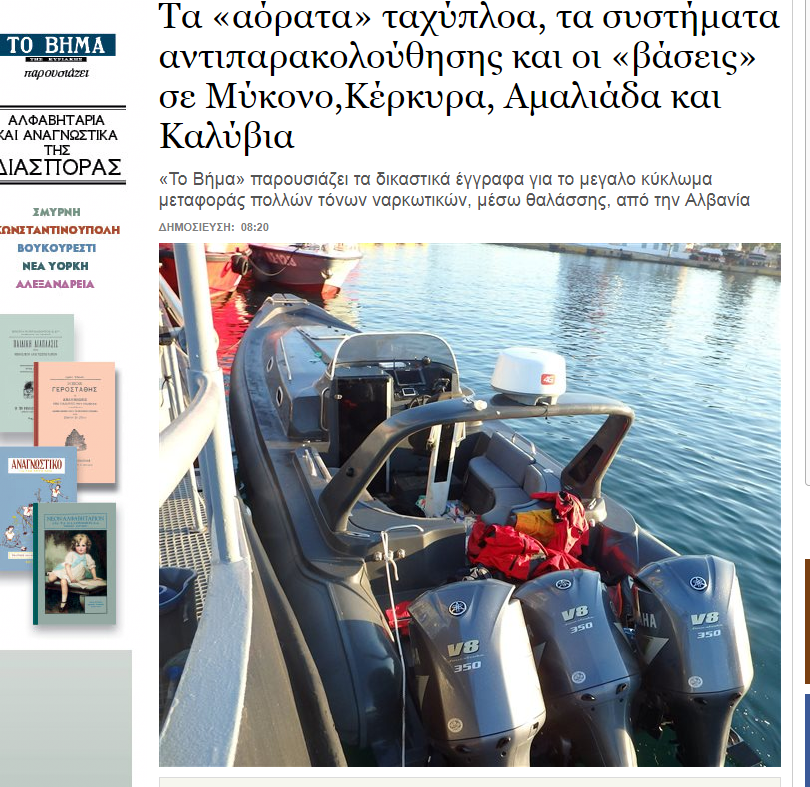 Mediat greke edhe ditën e sotme kanë vijuar me publikimin e detajeve të reja nga operacioni që u zhvillua për ndalimin e një gomone të nisur nga Himara, që transportonte 1.6 tonë drogë drejt Truqisë. Policia greke në këtë operacion të cilësuar historik arrestoi 11 persona gjithsej, mes tyre edhe 6 shqiptarë, por mediat greke flasin për ‘bosë’ të narkotrafikut nga Shqipëria, që drejtonin këtë grup kriminal. Në numrin e sotëm të gazetës “To Vima” theksohet se ky grup kriminal paguante 50-60 mijë euro për vendosjen e motorëve në gomone që të ishin gati për udhëtim, ndërsa disa prej gomoneve i deklaronin si të shkatërruara nga zjarri. Gjithashtu nënvizohet se grupi ishte i trajnuar për taktika që do t’i shpëtonin nga ndjekja në det. Gazeta greke shkruan ndër të tjera se anëtarët e këtij rrjeti të fuqishëm të narkotrafikut përdornin automjete me targa të huaja për të lëvizur brenda në qytet. “To Vima” zbulon për të parën herë pseudonimin e ‘bosit të madh’ shqiptar, i cili mban pseudonimin ‘Vito’ dhe është 31-vjeç, me shtetësi italiane dhe origjine shqiptare. Edhe televizioni “ANT1” ka publikuar disa detaje, duke nënvizuar se greku i arrestuar që kishte parking gomonesh është djalë polici, ndërsa nëna e tij shprehet se këtë gomone ai e mbajti tre muaj në parking thjesht në ruajtje.
