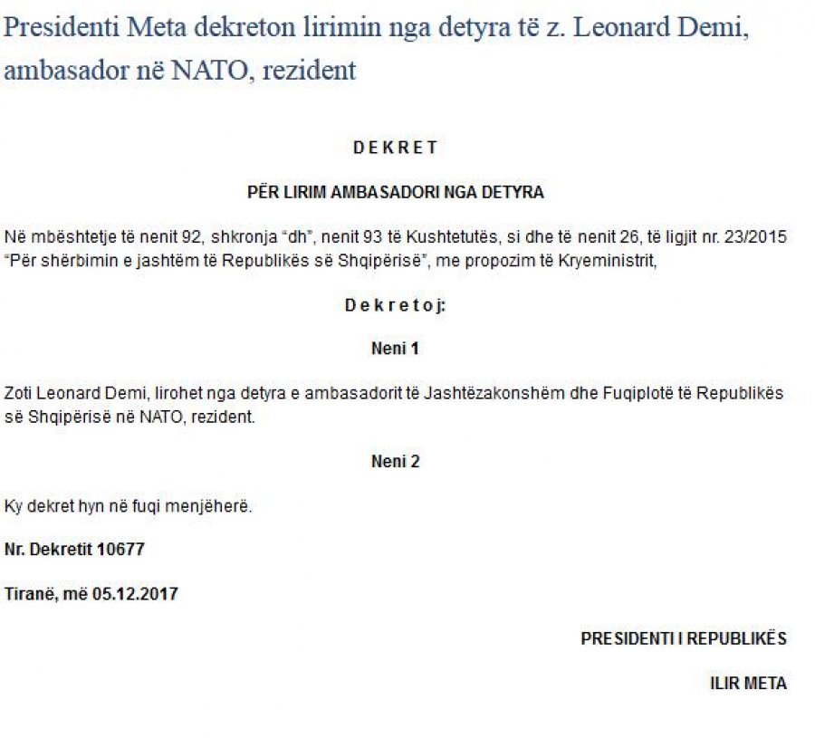 Presidenti Meta me vendimin e tij më të fundit ka dekretuar lirimin nga detyra të ambasadorit shqiptar në NATO, Leonard Demi.