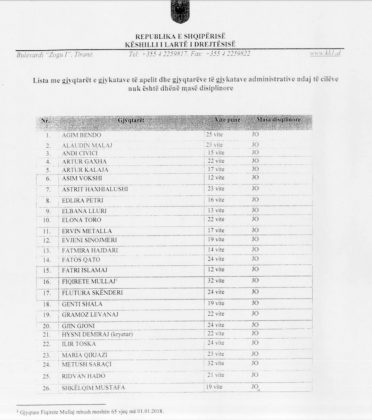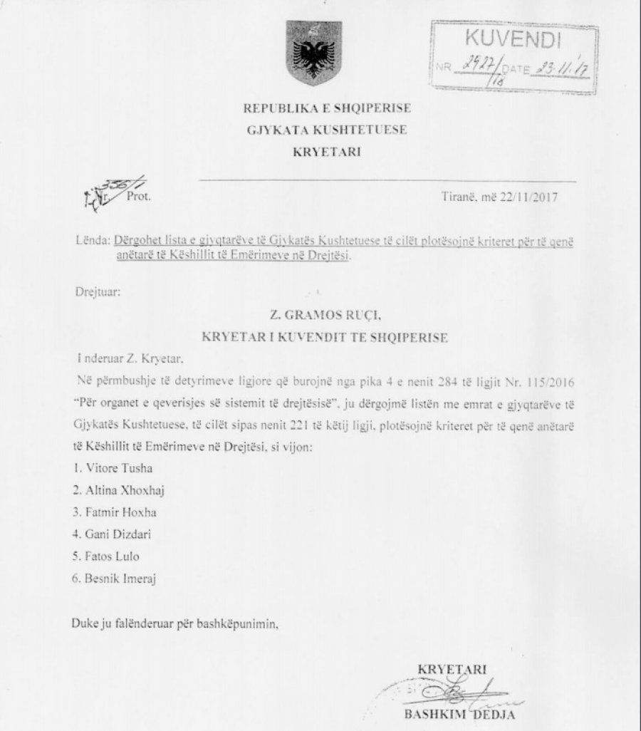 Lista nga Gjykata Kushtetuese përmban emrat: Gani Dizdari; Fatos Lulo; Besnik Imeraj; Viktore Tusha; Altina Xhoxhaj dhe Fatmir Hoxha