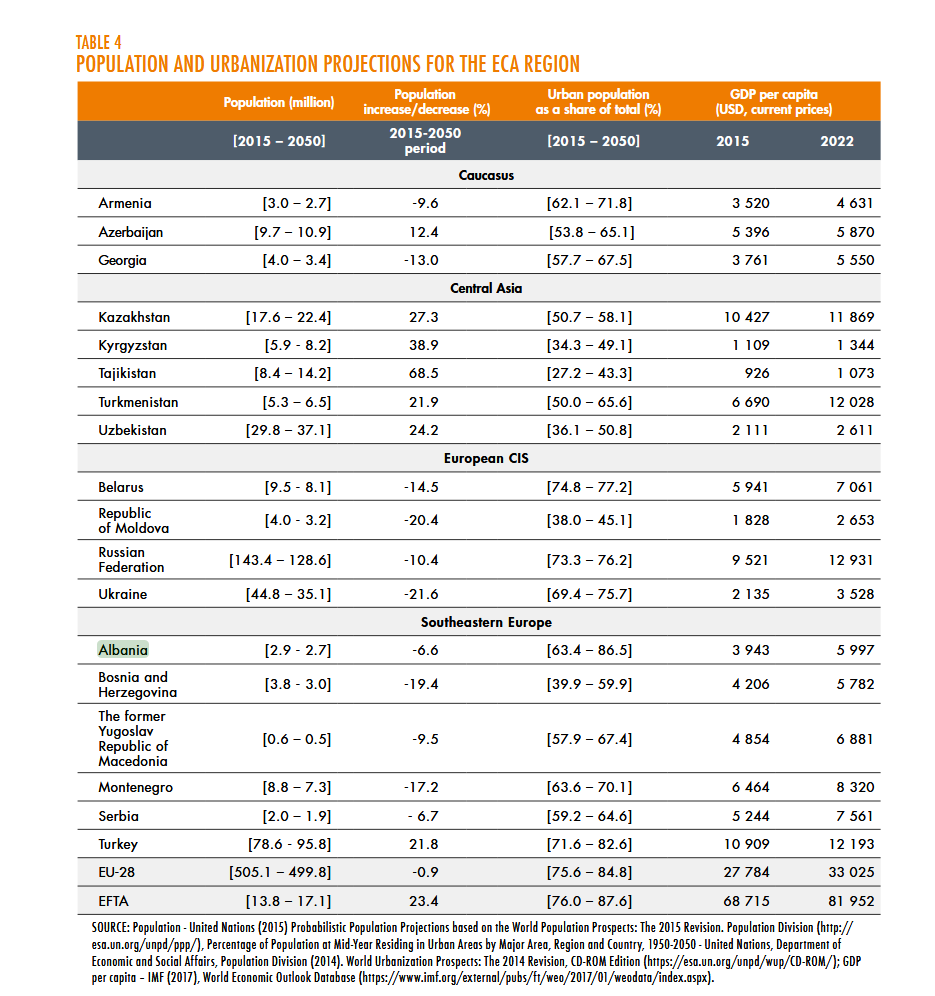 Numri i njerëzve që banojnë në zonat urbane pritet të rritet në të gjithë rajonin. Deri në vitin 2050, më shumë se gjysma e popullsisë së të gjitha vendeve të ECA, përveç Tazakistanit (43.3%) dhe Kirgistanit (49.1%), do të jetojnë në zonat urbane. Këto vende, së bashku me Uzbekistanin, janë burimet më të mëdha të migracionit për motive punësimi në rajon, si dhe prurjet më të mëdha të remitancave, kryesisht nga Federata Ruse dhe Kazakistani. Në nivel rajonal, urbanizimi më i lartë është parashikuar për vendet e BE-së (84.8% e popullsisë së përgjithshme do të banojë në qytete) dhe vendet e EFTA-s (87.6%). Në nivel vendi, popullsia më e madhe urbane pritet në Turqi (82.6%) dhe në Shqipëri (86.5%).