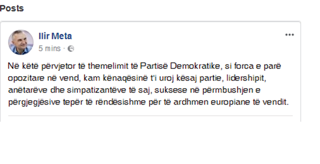Në këtë përvjetor të themelimit të Partisë Demokratike, si forca e parë opozitare në vend, kam kënaqësinë t’i uroj kësaj partie, lidershipit, anëtarëve dhe simpatizantëve të saj, suksese në përmbushjen e përgjegjësive tepër të rëndësishme për të ardhmen europiane të vendit.
