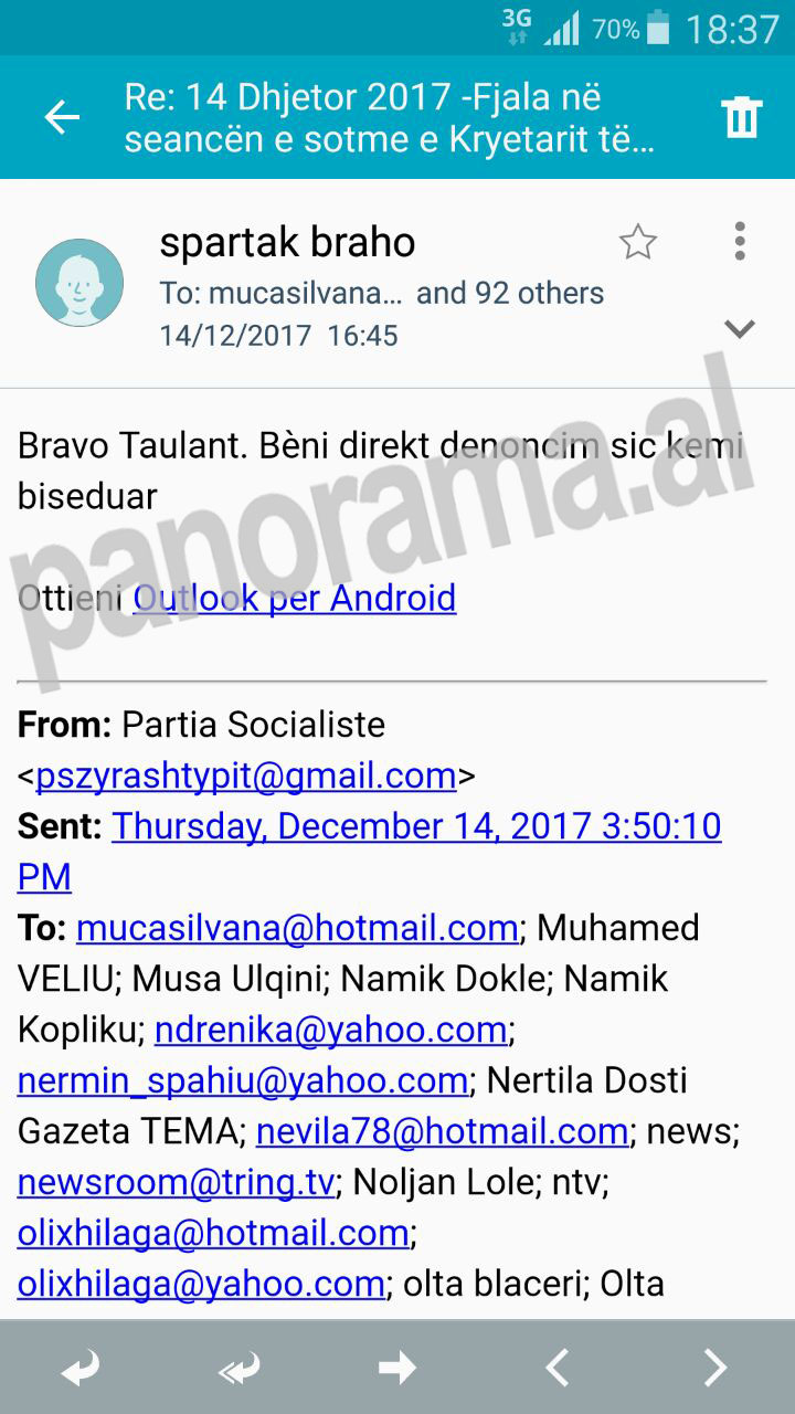 Një e-mail i zyrës së shtypit të Partisë Socialiste ka shpërndarë për mediat dhe jo vetëm, fjalën e plotë që mbajti në Kuvend, Taulant Balla. Mes marrësve të e-mailit ishte edhe ish-deputeti Spartak Braho.