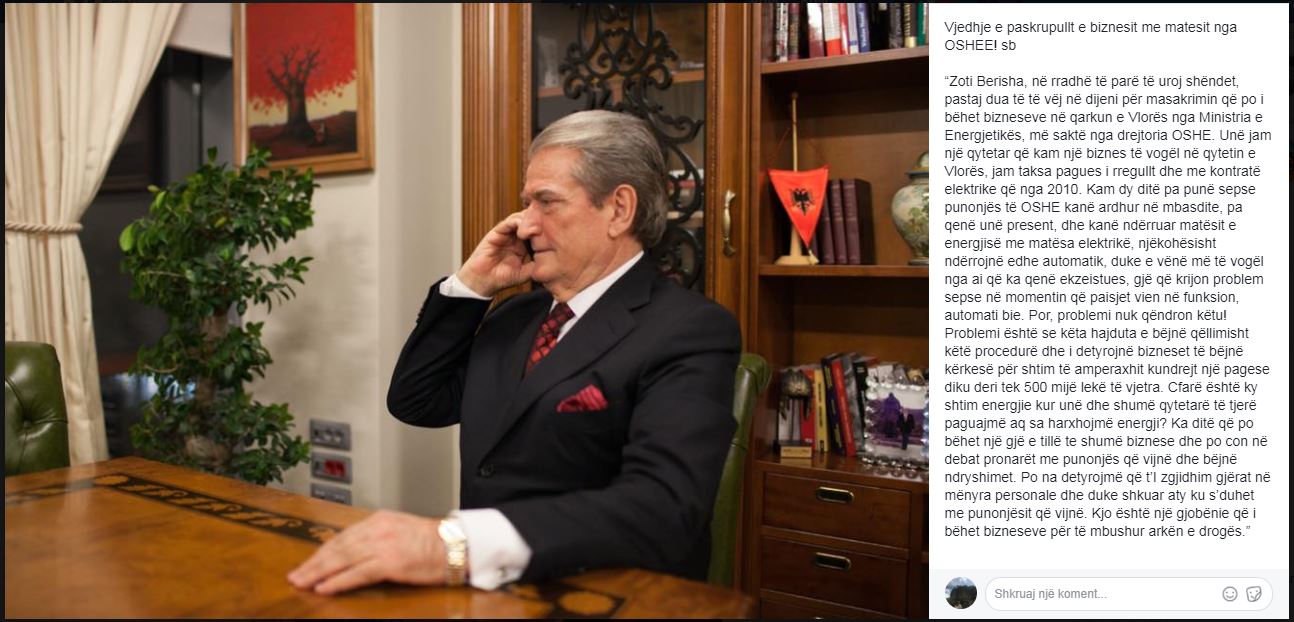 “Zoti Berisha, në radhë të parë të uroj shëndet, pastaj dua të të vë në dijeni për masakrimin që po i bëhet bizneseve në qarkun e Vlorës nga Ministria e Energjetikës, më saktë nga drejtoria OSHE. Unë jam një qytetar që kam një biznes të vogël në qytetin e Vlorës, jam taksa pagues i rregullt dhe me kontratë elektrike që nga 2010. Kam dy ditë pa punë sepse punonjës të OSHE kanë ardhur në pasdite, pa qenë unë prezent, dhe kanë ndërruar matësit e energjisë me matës elektrikë, njëkohësisht ndërrojnë edhe automatik, duke e vënë më të vogël nga ai që ka qenë ekzistues, gjë që krijon problem sepse në momentin që pajisjet vihen në funksion, automati bie. Por, problemi nuk qëndron këtu! Problemi është se këta hajdutë e bëjnë qëllimisht këtë procedurë dhe i detyrojnë bizneset të bëjnë kërkesë për shtim të amperazhit kundrejt një pagese diku deri tek 500 mijë lekë të vjetra. Çfarë është ky shtim energjie kur unë dhe shumë qytetarë të tjerë paguajmë aq sa harxhojmë energji? Ka ditë që po bëhet një gjë e tillë te shumë biznese dhe po KON në debat pronarët me punonjës që vijnë dhe bëjnë ndryshimet. Po na detyrojmë që t’i zgjidhim gjërat në mënyra personale dhe duke shkuar aty ku s’duhet me punonjësit që vijnë. Kjo është një gjobvënie që i bëhet bizneseve për të mbushur arkën e drogës”.