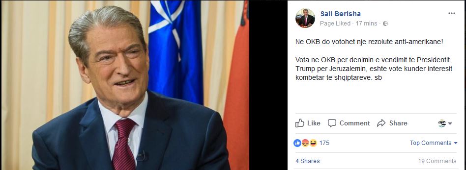 Sot në mbledhjen e Organizatës së Kombeve të Bashkuara do të diskutohet një rezolutë anti-Amerikane në lidhje me vendimin që Presidenti Trump mori, duke njohur Jerusalemin si kryeqytetin e Izraelit. Shqipëria deri më tani ka shprehur qëndrimin e saj kundër këtij vendimi të presidentit të SHBA. Në lidhje me këto zhvillime ka reaguar edhe ish-kryeministri Sali Berisha. Ai shkruan në faqen e tij në “Facebook”, se vota pro kësaj rezolute është votë kundër interesit të shqiptarëve.