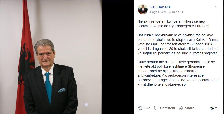 Nje akt i rende antikombetar i klikes se neo-bllokmeneve me ne krye Noriegen e Europes! Sot klika e noe-bllokmeneve hoxhist, me ne krye bastardin e xhelateve te shqiptareve Koleka, Rama votoi ne OKB, ne traditen aterore, kunder SHBA, vendit i cili nga vitet 20 te shekullit te kaluar deri sot ka luajtur rol percaktues ne lirine e kombit shqiptar. Duke denuar me ashpersi kete qendrim shtoje se me kete akt politika e jashtme e Shqiperise shnderrohet ne nje politike te mirefillte antikombetare. Ajo perfaqeson interesat e baroneve te droges dhe balozeve neo-bllokmene te krimit dhe jo te shqiptareve.