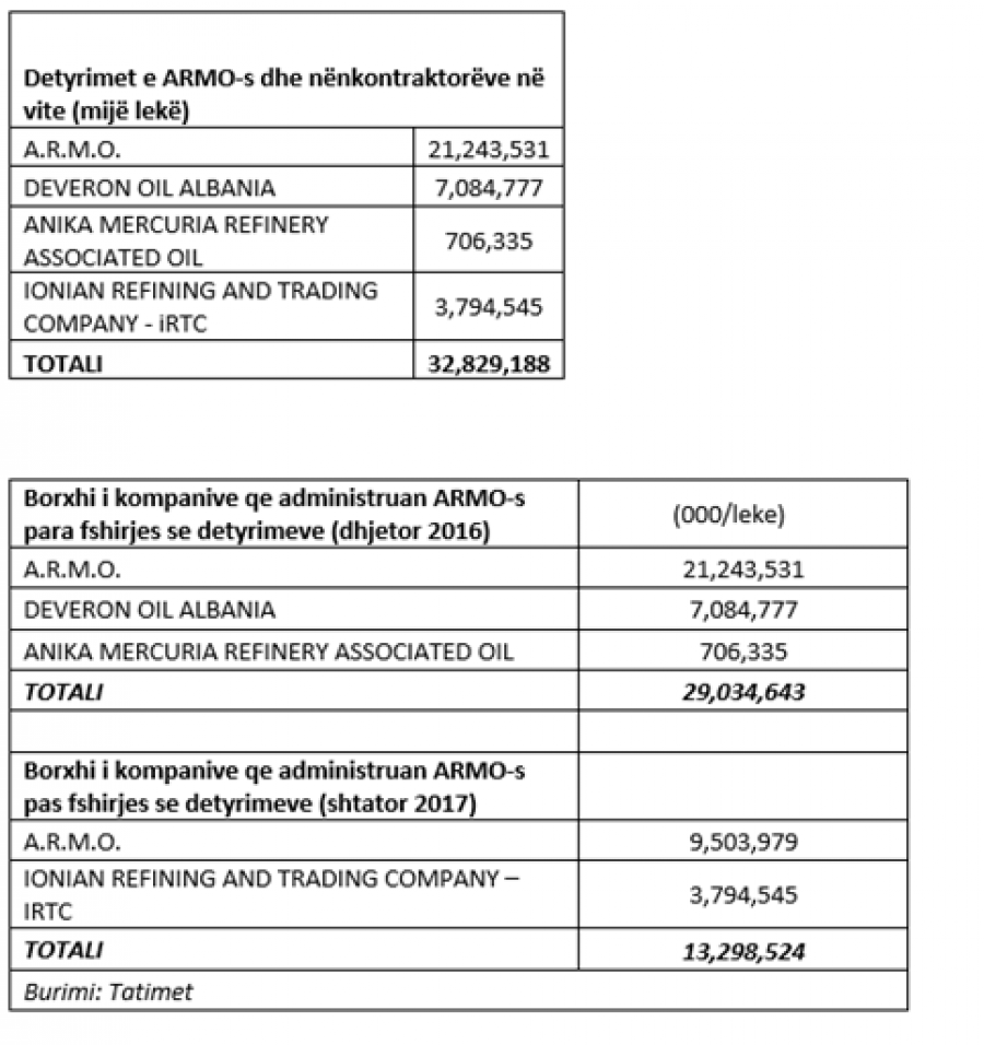 Sipas raportit të tatimeve në lidhje me borxhin tatimor shihet se, ARMO kishte 21 miliardë lekë detyrime të mbartura deri në fund të vitit 2016. Një pjesë e detyrimit është krijuar në momentin kur ajo administrohej nga Taçi Oil, e cila është në proces falimenti dhe me pak mundësi për të rikuperuar detyrimin. Por me falimentin e Taçi Oil dhe shitjen e ARMO-s tek azerët e Heaney Assets Corporation në gusht 2013, edhe kompanitë që e morën në përdorim vijuan me kulturën e mospagimit të taksave. Detyrime të larta krijuan edhe nënkontraktorët. Borxhin më të lartë e krijoi kompania Deveron që, sipas tatimeve, deri në fund të vitit 2016 kishte akumuluar mbi 7 miliardë lekë detyrime në tatime.