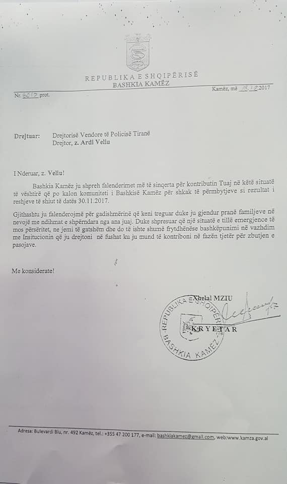 Drejtoria Vendore Policisë Tiranës ka marrë një tjetër falenderim dhe mirënjohje për kontributin e dhënë nga ana e Policisë përsa i përket përmbytjeve të ndodhura në qark dhe sensibilizimi në familjet e përmbytura duke ofruar mbështetje dhe kontribut vullnetar. Në shkresën drejtuar Drejtorit të Policisë Tiranës z.Ardi Veliu, Bashkia Kamëz me Kryetar z. Xhelal Mziu, ka shprehur falenderime të sinqerta për kontributin në situatën e vështirë që po kalon komuniteti i Bashkisë Kamëz si shkak i përmbytjeve të fundit.