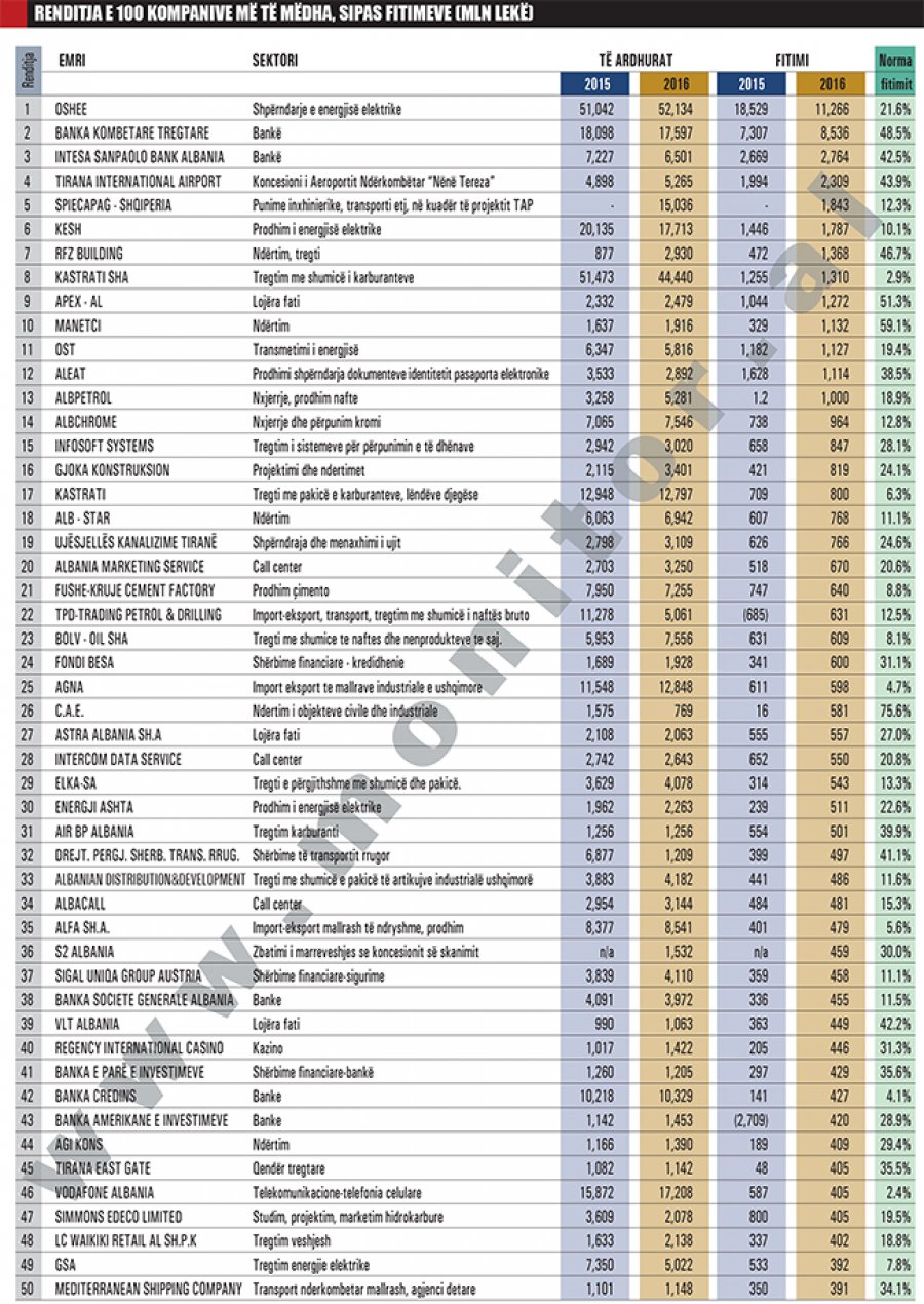 Sipas të dhënave nga bilancet e kompanive, të përpunuara nga Monitor, 100 subjektet me fitim më të lartë në vend, fituan në total 62 miliardë lekë, ose 505 milionë euro. Kjo përbën 35% të të gjitha fitimeve të deklaruara në Shqipëri në 2016-n. (bazuar në tatimfitimin e paguar në 2016-n, fitimet totale të biznesit arrijnë në 194 miliardë lekë). Fitimet e 100 subjekteve janë sa 5% e asaj që prodhon ekonomia në një vit (Prodhimi i Brendshëm Bruto). Fitimet e 100 më të mëdhenjve janë sa dyfishi i atyre që fituan në total mbi 93 mijë biznese të vogla, sipas të dhënave të përpunuara nga Monitor. Sipas Anketës Strukturore të Ndërmarrjes 2015 (e fundit e disponueshme), 93,376 subjekte me 1-4 punonjës raportuan fitime prej 38 miliardë lekësh.