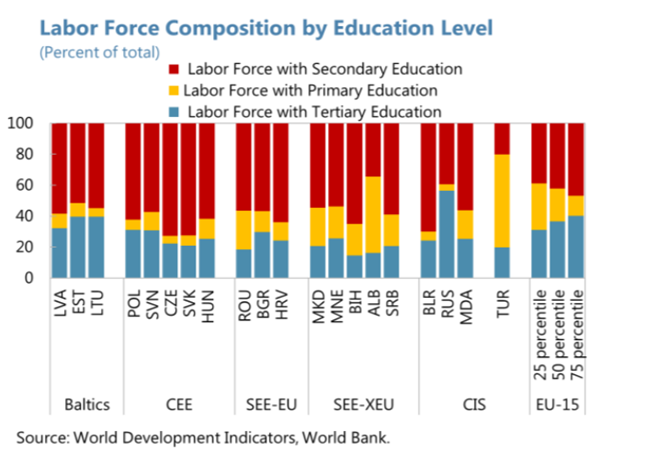 Nga 20 vendet në zhvillim të Europës, Turqia dhe Shqipëria renditen të parat për fuqinë e madhe punëtore me nivel të ulët të arsimit. Në Turqi, rreth 60% e forcës së punës është me arsim primar. Ndërsa vendet baltike si Rusia, Estonia dhe Lituania kanë përqindjet më të larta të forcës së punës më arsim të lartë. Në rajonin e Ballkanit, Serbia dhe Mali i Zi kanë përqindjet më të larta të forcës së punës me arsim të lartë. Serbia dhe Bosnja, nga ana tjetër, kanë përqindjen më të madhe të fuqisë punëtore me arsim të mesëm dhe për rrjedhojë, kanë më pak popullsi në moshë pune me arsim fillor. Në një krahasim më të gjerë të 20 vendeve në zhvillim të Europës shihet se Çekia dhe Sllovakia janë vendet që rreth 70% të forcës së punës e kanë me arsim të mesëm. Nga ana tjetër, sipas projeksioneve të Kombeve të Bashkuara, forca e punës në Shqipëri ka hyrë në fazën e një tranzicioni të thellë, për shkak të plakjes së popullsisë prej emigracionit të lartë dhe rënies së numrit të lindjeve.