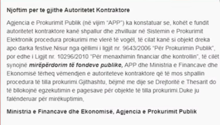 Agjencia e prokurirmit publik ka nxjerrë një vendim sipas të cilit të gjitha prokurimet në vlera të vogla për mbrëmje të zyrave publike për festat e fundvitit nuk do të egzekutohen më nga kjo agjenci duke u bërë thirrje institucioneve t’i bllokojnë ato. Sipas njoftimit dega e thesrait në ministrinë e Financave do të bllokojë cdo financim të darkave apo drekave festive.
