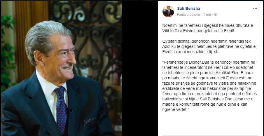 Sipas mesazhit të publikuar nga Berisha, në Fier ka nisur ndërtimi në fshehtësi i inceneratori, në afërsi të ish-Azotikut.
