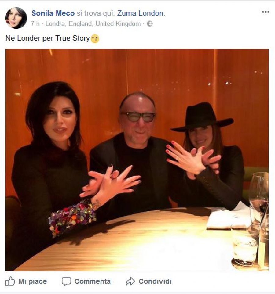 Në foton që Meço ka bërë publike në Facebook, ajo shkruan se ndodhet atje për histori të vërteta. ‘Në Londër për True Story’, shkruan Sonila Meço në Facebook, duke paralajmëruar ndoshta edhe emrin që pritet të mbajë emisioni i saj në Top Channel, pas largimit të Sokol Ballës në një televizion tjetër.