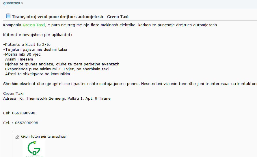 Nderkaq prej disa muajsh kompania ka filluar aplikimet per pune te taksisteve. Droni.al gjeti aplikimet dhe thirrjen per pune te taksisteve. Aplikimet kane filluar ne tetor dhe kush per taksistet eshte gjuha e huaj anglisht. Duket qarte se green taxi do te jete ne prag te disa ekskluziviteteve te tjera sic jane transporti nga Riunas ne Tirane e anasjelltas, apo sherbime koncesionare per protokollin e shtetit.