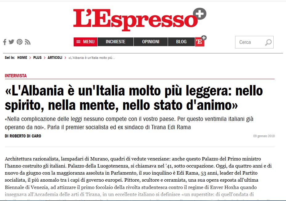 Kryeministri Edi Rama ka dhënë së fundmi një intervistë për gazetën prestigjioze italiane “L’Espresso”. ROBERTO DI CARO, gazetari që ka realizuar intervistën, në artikullin hyrës e ka cilësuar kryeministrin Rama si një ndër kryeministrat më anormal në Europë.