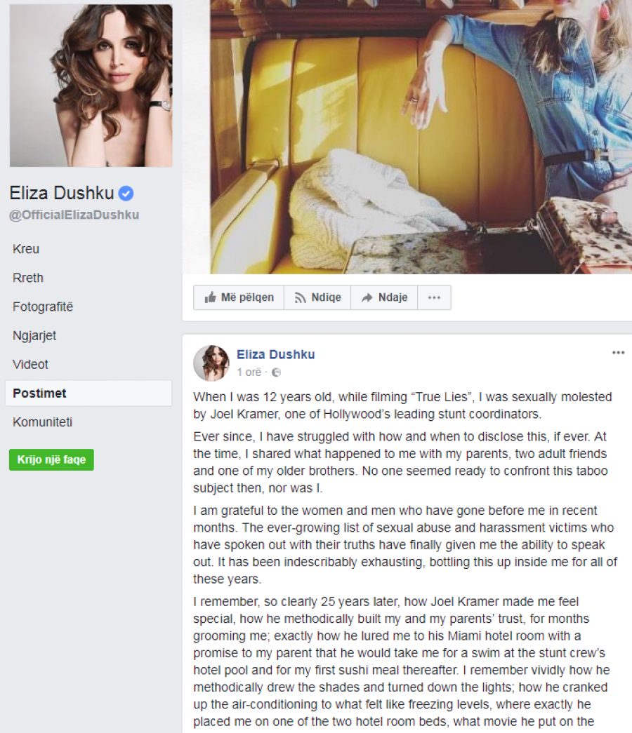 Mes shumë aktoresh të abuzuara seksualisht qëndron edhe shqiptaro amrikanja Eliza Dushku, autore e “Dear Albania” (E dashur Shqipëri) e cila është ngacmuar seksualisht në moshë 12 vjeçare. Në një status në “Facebook” Eliza Dushku tregon një kujtim të hidhur të 25 viteve më parë. Ngacmimi ka filluar teksa ajo po xhironte filmin “True Lies”, nga njëri prej koordinatoret kryesorë të skenave të rrezikshme në Hollywood”, Joel Kramer. Eliza shprehet se ka luftuar me veten duke u munduar të gjej mënyrën dhe kohën për ta bërë publike këtë por, nuk kishte mundur. Në dijeni të kësaj historie kanë qenë prindërit vëllai dhe dy miqtë e saj të cilët nuk i kishin ardhur në ndihmë.