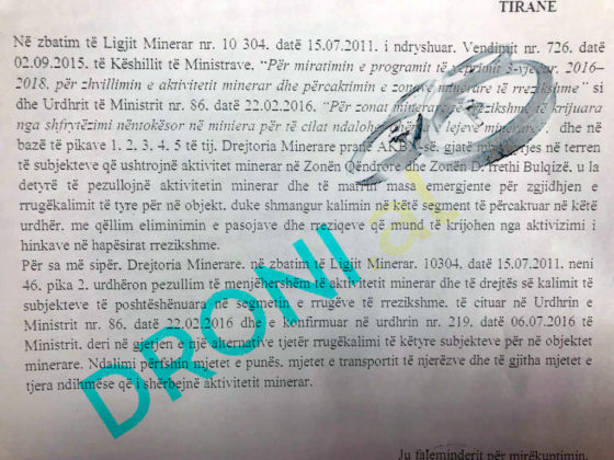 “Në zbatim të Ligjit ‘Minerar’ nr. 10304, neni 46 pika 2, urdhëron pezullim të menjëhershëm të aktivitetit minerar dhe të drejtës së kalimit të subjekteve të poshtëshënuara në segmentin e rrugëve të rrezikshme të cituara në Urdhrin e Ministrit nr. 86, datë, 22. 02. 2016 dhe e konfirmuar me në Urdhrin e Ministrit nr. 219, datë, 06. 07. 2016, deri në gjetjen e një alternative tjetër rrugëkalimi të këtyre subjekteve për në objektet minerare. Ndalimi përfshin mjetet e punës, mjetet e transportit, të njerëzve dhe të gjitha mjetet e tjera që i shërbejnë aktivitetit minerar”, thuhet në shkresën e Drejtorit Ekzekutiv i AKBN-së Adrian Bylyku. DRONI.al