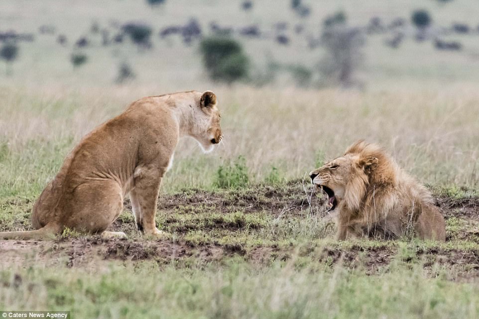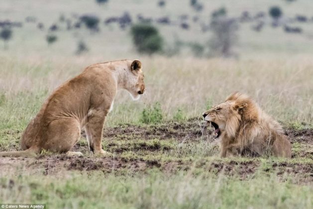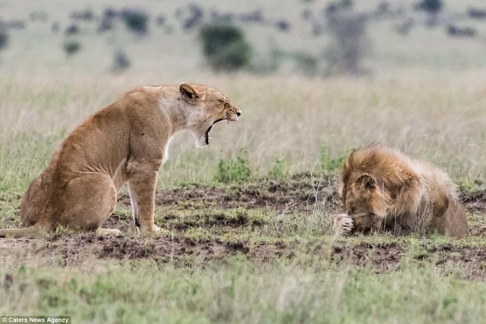 Mund të jetë Mbreti i Xhunglës, por në “shtëpinë” e luanit bosi është gruaja, siç duket nga fotot. Luanesha shihet e tërbuar duke iu hakërryer luanit, i cili fsheh me putra kokën e ulur.