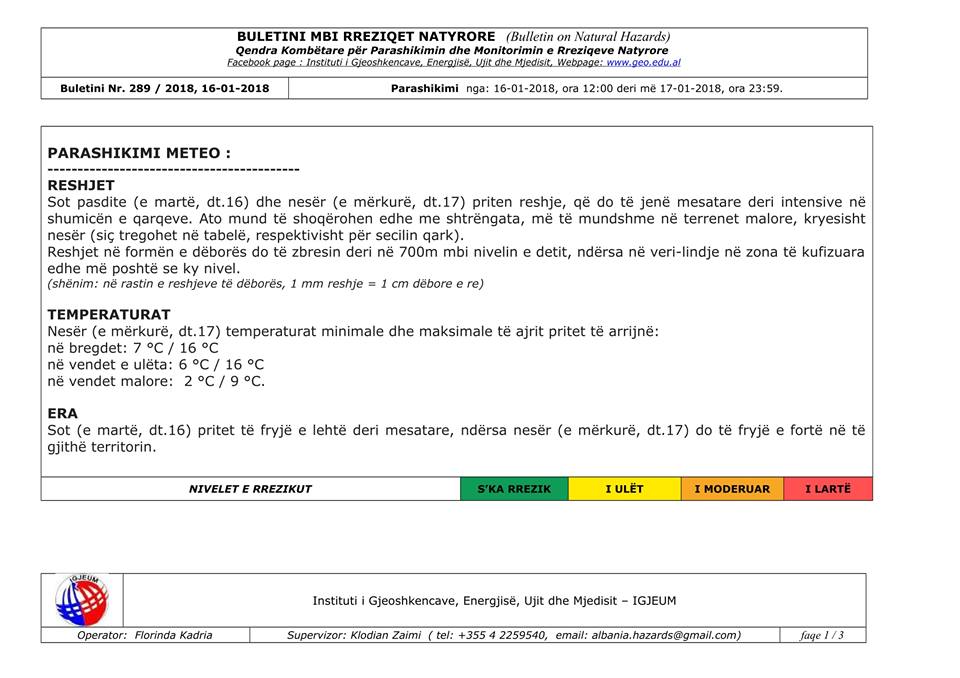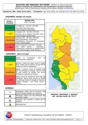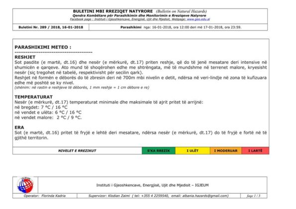 Ditën e sotme do të jetë me reshje, që do të jenë mesatare deri intensive në shumicën e qarqeve, bën me dije IGJEUM. Reshjet mund të shoqërohen edhe me shtrëngata, më të mundshme në terrenet malore. Reshjet në formën e dëborës do të zbresin deri në 700 m mbi nivelin e detit, ndërsa në veri-lindje në zona të kufizuara edhe më poshtë se ky nivel.