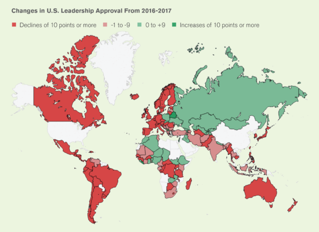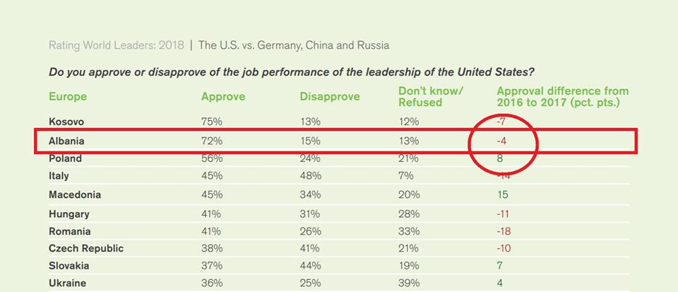 Megjithatë, raporti tregoi se edhe në këto dy vende mbështetja për Shtetet e Bashkuara kishte rënë në krahasim me vitin e kaluar. Përgjatë vitit 2017 Lidershipit të SHBA në Shqipëri ra me -4%.
