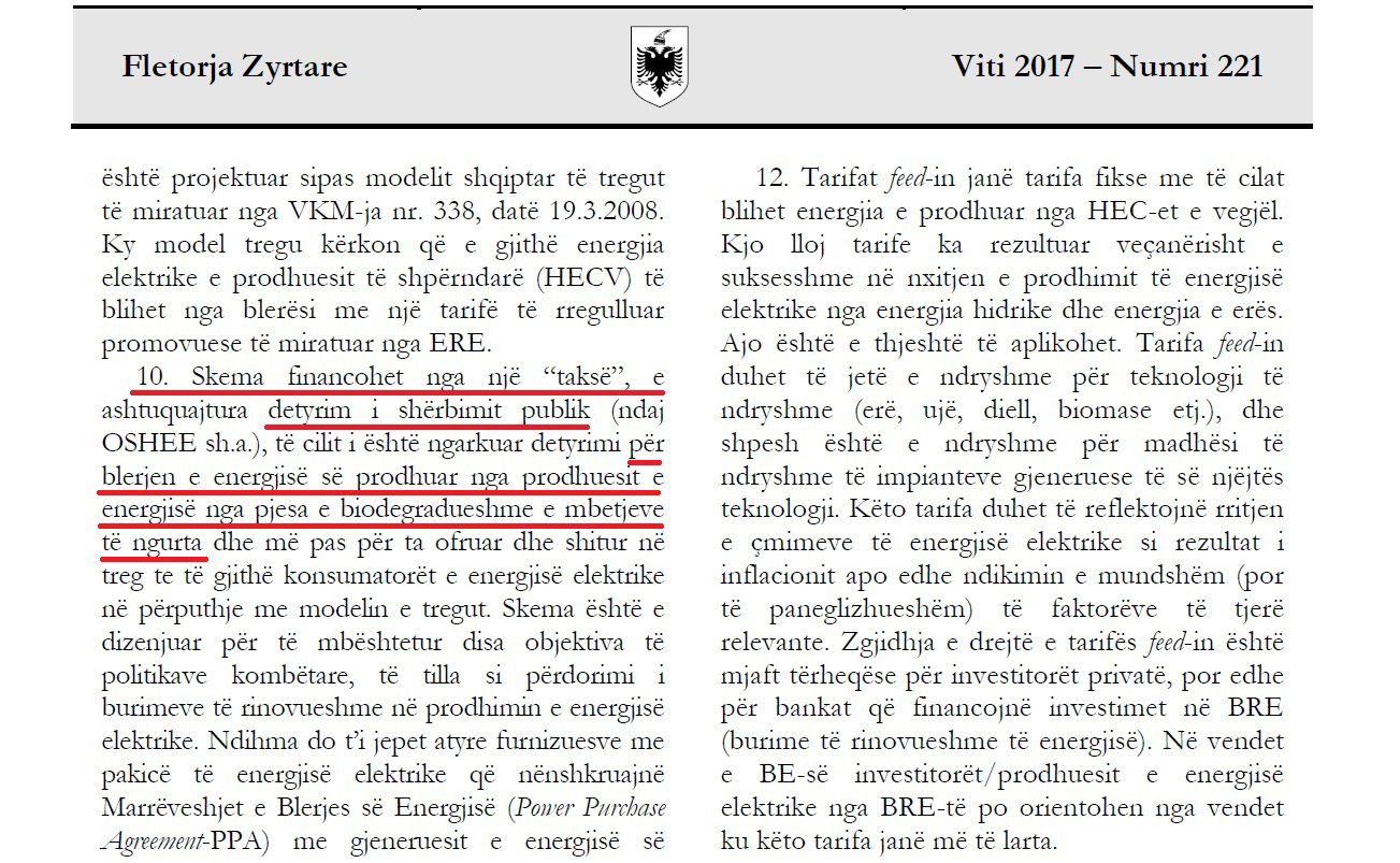 Ja, edhe pika 10 ku thuhet se “Skema financohet nga një “taksë”, e ashtuquajtura detyrim i shërbimit publik (ndaj Operatorit të Shpërndarjes), të cilit i është ngarkuar detyrimi për blerjen e energjisë nga prodhuesit e energjise prej pjesës së biodegradueshme të mbetjeve të ngurta dhe më pas për ta ofruar dhe shitur në treg”.