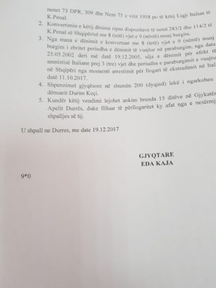 Mësohet se Prokuroria, që në seancat e para, ka kërkuar njohjen e vendimit me 9 vjet, ndërkohë që Gjykata e Durrësit e ka njohur me 8 vite e 9 muaj këtë vendim. Duke qenë se vendimi i Gjykatës është pothuaj i njëjtë me atë të kërkuar, atëherë, Prokuroria nuk e ka apeluar. Në këto kushte, vendimi ka marrë formë të prerë pas pak ditësh nga afati kur mund të kryhej apelimi. Mësohet, gjithashtu, se vetë Ministria e Drejtësisë italiane kërkesën për ekstradim e ka kthyer në njohje vendimi.