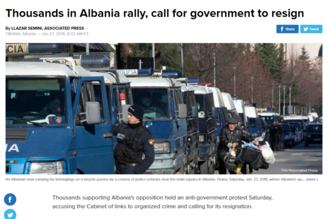 Agjencia ndërkombëtare e lajmeve Assosiated Press shkruan se opozita e Shqipërisë zhvilloi një protestë kundër qeverisë duke e akuzuar për lidhje me krimin e organizuar dhe bënë thirrje për dorëheqjen e saj. Më tej në shkrimin e AP-së thuhet se mijëra mbështetës të Partisë Demokratike dhe të aleatëve të saj si Lëvizja Socialiste për Integrim dhe partitë e tjera më të vogla u mblodhën të shtunën në kryeqytetin e Tiranës, për të protestuar kundër qeverisë.