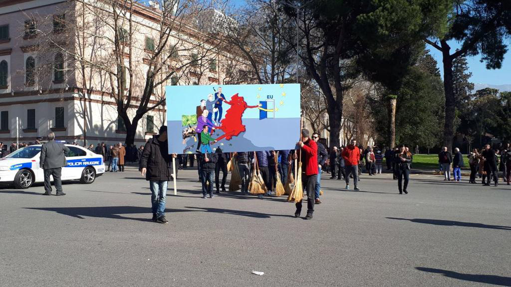 Risi tjetër në prag-protestën e sotme të opozitës, kanë qenë fshesat në duart e të rinjve dhe mesazhet e tyre për të pastruar Shqipërinë nga pengmarrësit që nuk e lejojnë të hyjnë në Europë.