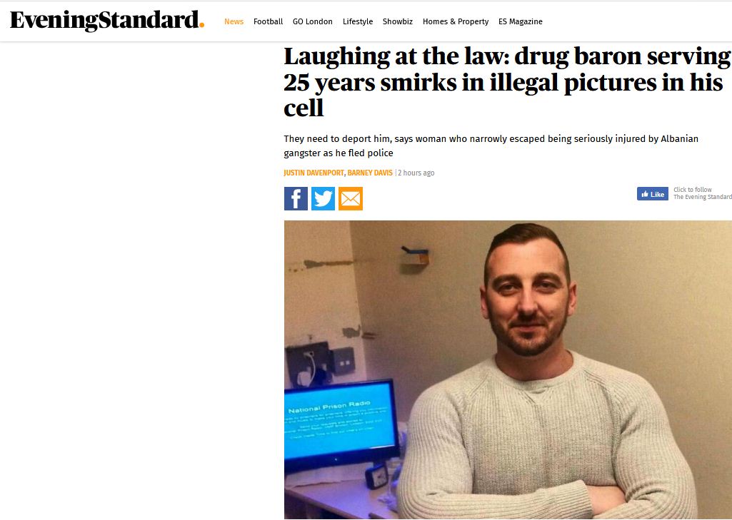Gazeta londineze “Evening Standard” ia ka kushtuar sot faqen e parë një baroni shqiptarë droge i cili poston në Instagram foto nga burgu ku vuan dënimin. E përditshmja londineze shkruan se baroni shqiptarë tallet me sistemin e burgjeve teksa thekson se ai është Tristen Asllani i dënuar me 25 vite burg vitin e shkuar.