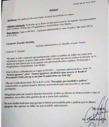 Avokati i prokurores Rovena Gashi kërkoi sot nga Gjykata Administrative të thirrej për të dëshmuar në gjyq Prokurorja e Përgjithshme e Përkohshme Arta Marku.