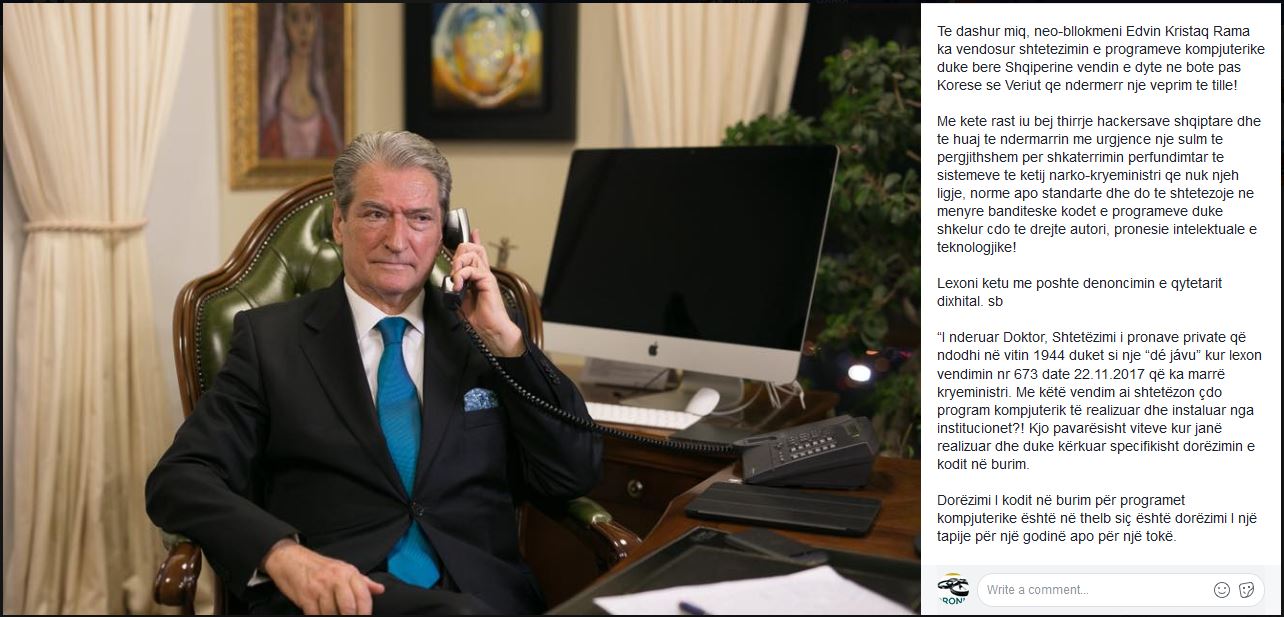 “Me këtë rast iu bëj thirrje hackersave shqiptarë dhe të huaj të ndërmarrin me urgjencë një sulm të përgjithshëm për shkatërrimin përfundimtar të sistemeve të këtij narko-kryeministri që nuk njeh ligje, normë apo standarde dhe do të shtetëzojë në mënyrë banditeske kodet e programeve duke shkelur cdo të drejtë autori, pronësie intelektuale e teknologjike!”, shkruan Berisha