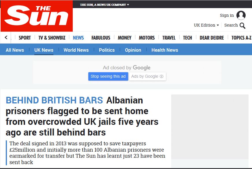 “The Sun” shkruan sot se marrëveshja e nënshkruar në vitin 2013 duhej të shpëtonte taksapaguesit angleze me së paku 2.5 milionë paund dhe fillimisht do transferonte më shumë se 100 të burgosur shqiptarë, por media angleze raporton se vetëm 23 prej tyre janë kthyer.