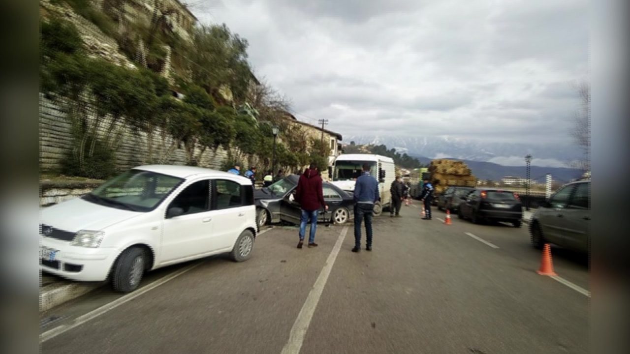 Mjeti me targa AA 950A C është përplasur me mjetin tip Wolksvagen me targa AA 252 LN dhe mjetin tip Benz me targa AA 179 DH. Si pasojë e aksidentit, drejtuesi i mjetit me targa AA 950 AC shtetasi E. M., 30 vjeç dhe pasagjerja K. Ç., 25 vjeçe kanë mbetur të plagosur dhe janë transportuar për në Spitalin Rajonal Berat ku po marrin ndihmë mjekësore.